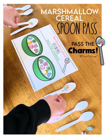 Pass the Charms! To Play: Using both hands, place a marshmallow in the first spoon (furthest from the mat). Using both hands at the same time, pick up the first outer spoon. Pass the marshmallow from one spoon to the next. In order to do this, child will flip the spoon, dropping marshmallow from one spoon to next. Move the marshmallow from the outer spoon to the cereal bowl mat. Repeat steps 1-2 for remaining marshmallows.