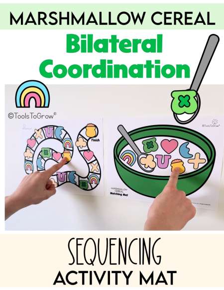 To Complete: Tape the mats side by side. Sequence Mat will be on the right side. The Matching Marshmallow Icons Bowl Mat will be on the left side. Child sits/stands midline in front of both mats. Child uses right hand to point to starting marshmallow icon on sequence mat. At the same time, child uses left hand to point to the matching icon on the Matching Marshmallow Icons Bowl Mat. Repeat as child moves sequentially from one marshmallow to another along the sequence mat. Optional: Repeat switching orientation of mats/hands.