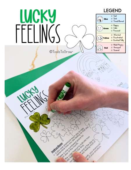 Instructions: Color one shamrock each day to help determine how you are feeling for that day. Each shamrock has a number for the day of the month. Use the color legend below to indicate how you are feeling at the time of coloring. Or, color toward the end of the day to indicate how you were feeling most of the day. By the end of the month, your shamrocks will show a visual map of your emotions.