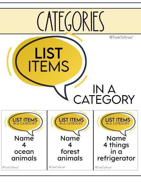 ABOUT: Children benefit from a broad knowledge of categories which are an aspect of vocabulary development. This divergent naming technique is used to encourage a student to generate multiple responses.