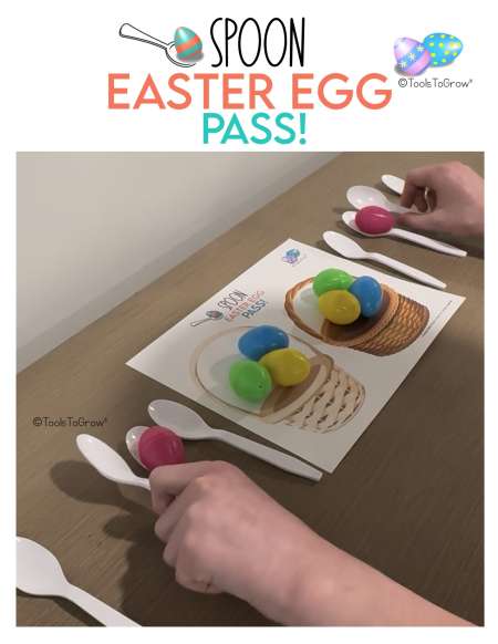 Using both hands at the same time, pick up the first outer spoon. Pass the egg from one spoon to the next. In order to do this, child will flip the spoon, dropping the egg from one spoon to next. Move the egg from the outer spoon to the Easter Basket Mat.