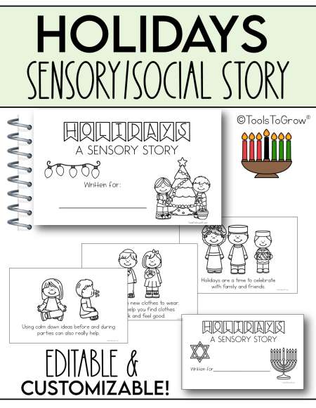 This Sensory Story Includes: 43 Different Story Pages and Sensory Strategies. Personalize title page. Versions Include: Christmas, Hanukkah, and Kwanzaa Title Pages! Simply print, select pages and place in the correct sequence in the Holiday story book. Once all pages are properly arranged, staple on the left. Enjoy reading with your child! Happy Holidays!