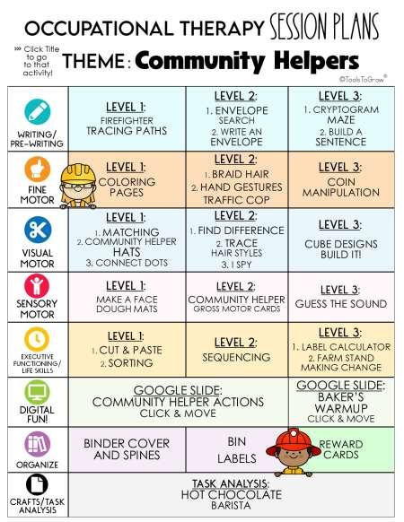 This 146 page PDF includes detailed session plans with the theme "COMMUNITY HELPERS". Categories Include: Writing/Pre-Writing, Fine Motor, Visual Motor, Sensory Motor, Life Skills/Executive Functioning, Digital Activities, Organize, and Task Analysis. Click on the Main Menu to go directly to that activity!