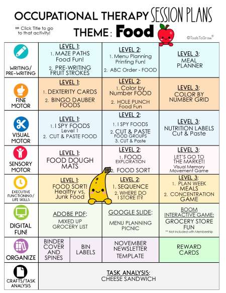 This 102 page PDF includes detailed session plans with the theme "FOOD". Categories Include: Writing/Pre-Writing, Fine Motor, Visual Motor, Sensory Motor, Life Skills/Executive Functioning, Digital Activities, and Organize. Click on the Main Menu to go directly to that activity!