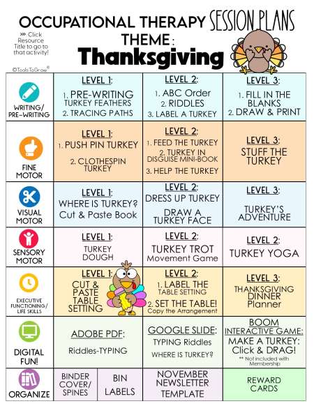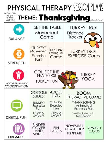 This 56 page PDF includes detailed session plans with the theme "THANKSGIVING". Categories Include: Balance, Strength, Motor Planning/Coordination, Digital Activities, and Organize. Click on the Main Menu to go directly to that activity!