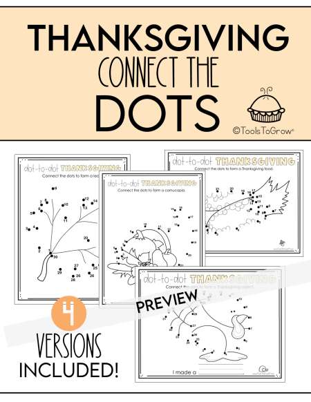 Connect the dots to form the Thanksgiving Pictures. Includes: Leaf, Turkey, Corn, and Cornucopia.