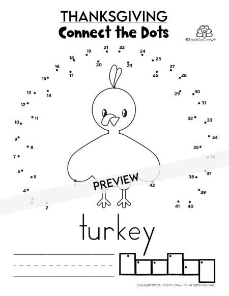 Complete the dot-to-dot turkey. Next, print the word "turkey" on the dotted line, and boxed line.