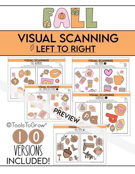 Includes scanning for fall items, numbers, uppercase letters, and reversals. Look at the box on the left and study all the fall items. Next, look at the box on the right and say what item is missing.